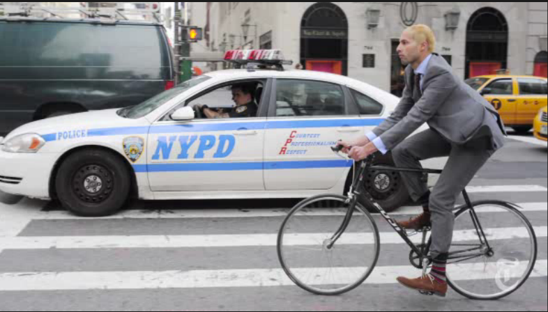 Then, yesterday, the Times published a wonderful little multimedia essay by its legendary fashion photographer Bill Cunningham. In “Spoke Spinners,” Cunningham talks with his usual charm over a stream of photographs he’s taken of New Yorkers on bicycles. Here’s a screen shot: