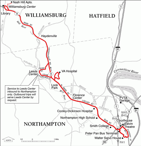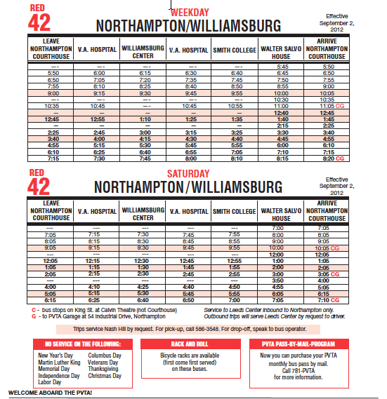 The Red 42 is a bus route operated by the Pioneer Valley Transit Authority of Western Massachusetts. The route runs between Northampton and Williamsburg, though it’s probably most often used for getting patients, employees, and visitors to and from the VA Hospital, located on Route 9 between the two towns. Although I’m a frequent user of PVTA buses, I had never been on the R42; and, because I knew I would be entirely dependent on the PVTA for this part of my experiment, I decided to do the transit journey first.