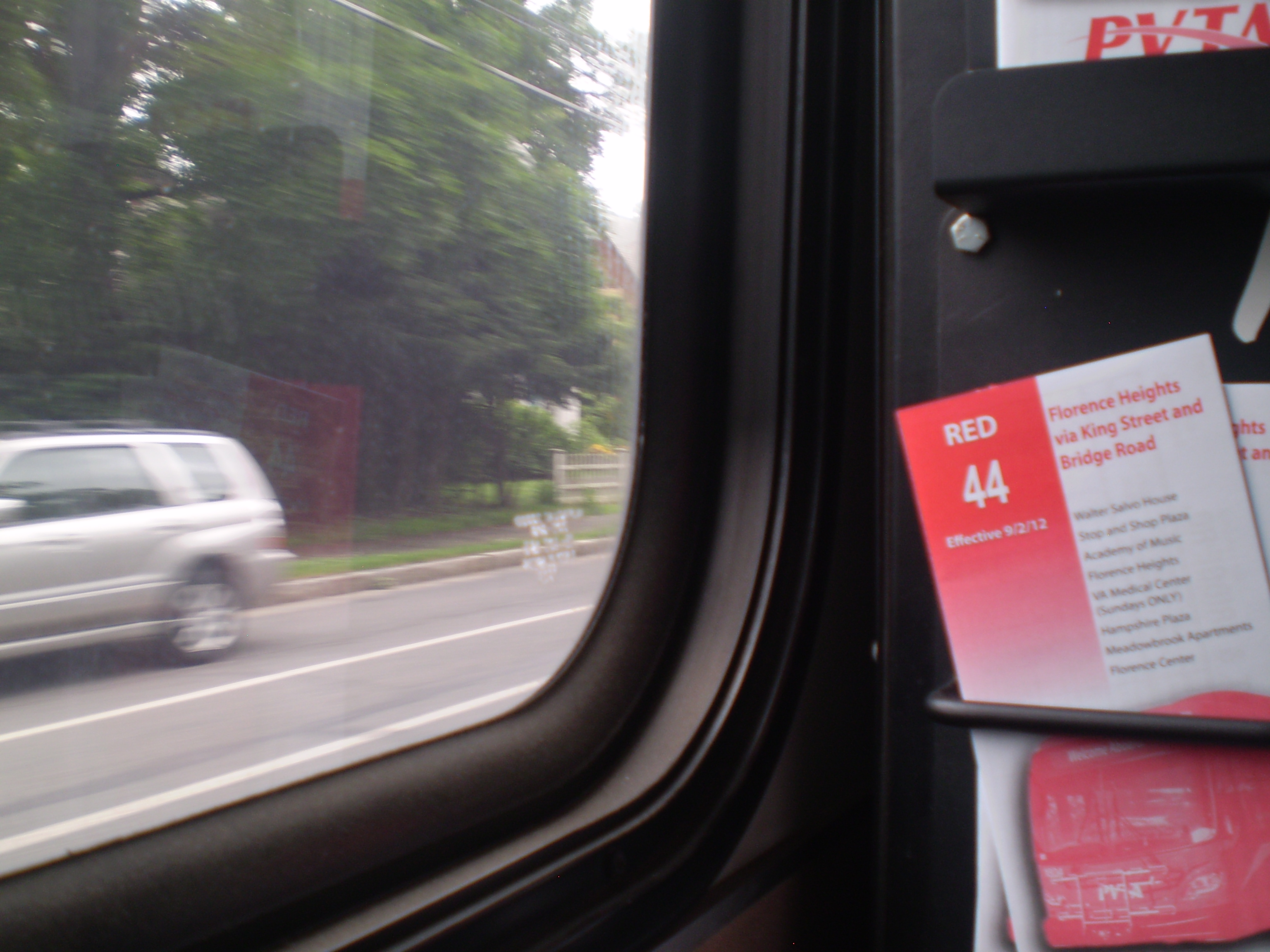 When the bus pulled up at 2:30, I took a photograph before boarding, knowing that I would be blogging about this trip. On entering the bus, though, I was told by the driver that the PVTA forbade such practice and asked to delete the picture in front of him. This was very disappointing!