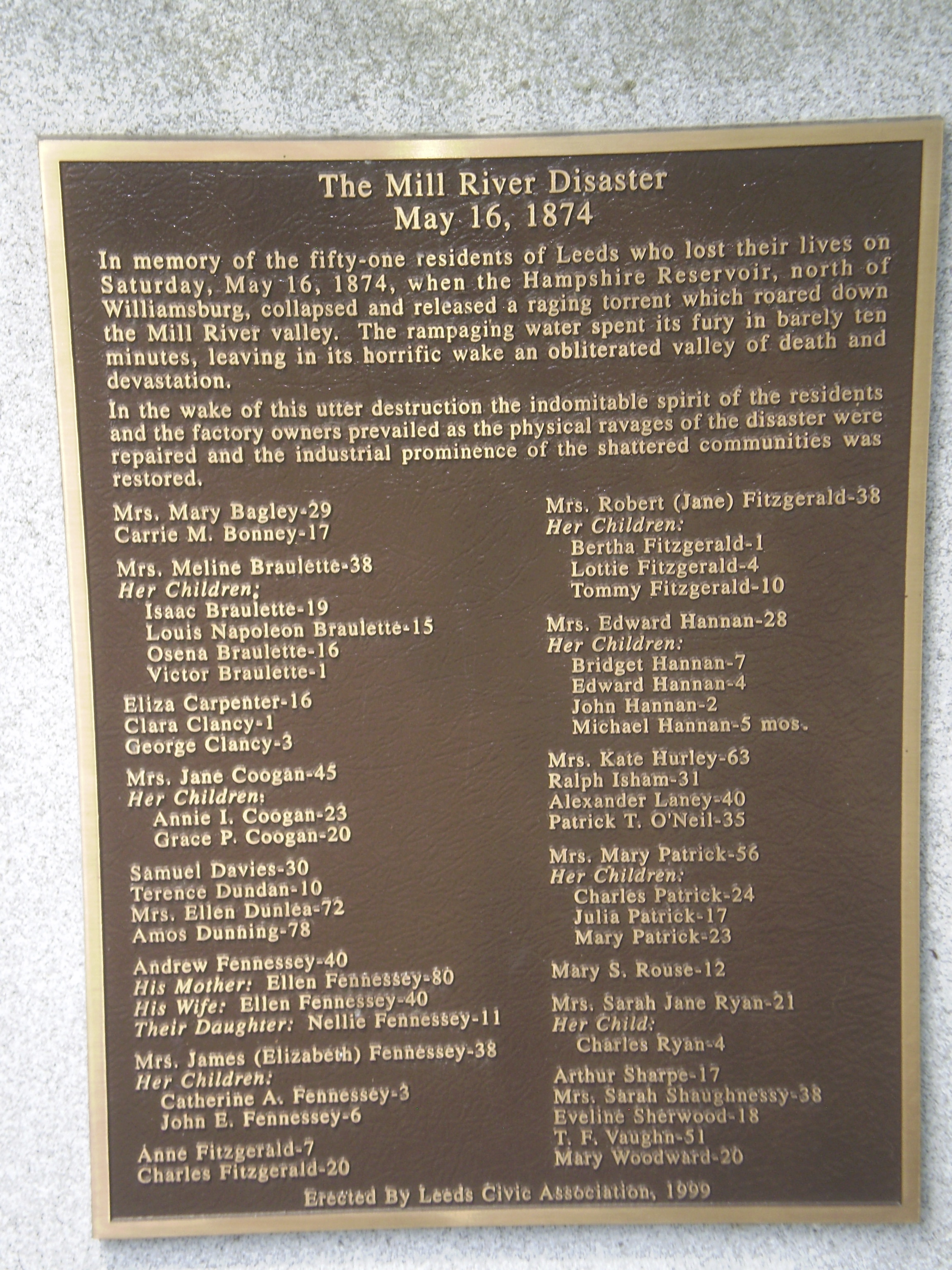 In Leeds itself, I stopped to read a plaque memorializing the victims of the Mill River flood, which, according to Elizabeth M. Sharpe, was one of the greatest calamities of the nineteenth century: “It happened early one May morning in 1874, in the hills above the western Massachusetts towns of Williamsburg and Northampton, when a reservoir dam (used for waterpower) suddenly burst, sending an avalanche of water down a narrow valley lined with factories and farms. Within an hour, 139 people were dead, and four mill villages were washed away.” The flood haunted my trips to Williamsburg – I not only walked or rode by the Mill River for much of the project, but I kept coming across signs of the disaster. There’s another plaque memorializing victims in Williamsburg, and parts of the river valley, Leeds and Haydenville in particular, seem eerily quiet, almost abandoned, as if still traumatized by the past. Sharpe argues, in fact, that the Mill River valley never fully recovered from that flood.