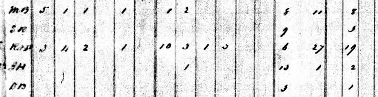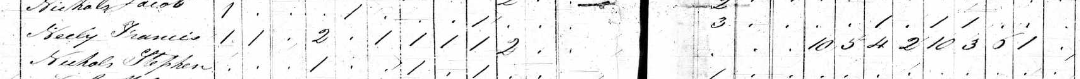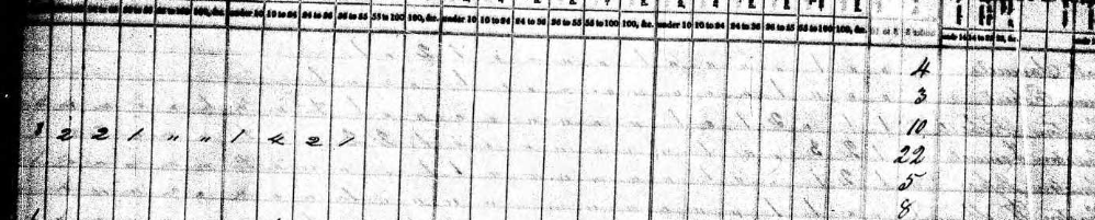 The eight filled columns on the right-hand side of the census form (shown below) list, first, Francis’ male slaves and then his female slaves in four age categories: under 14, between 14-25, 26-44, and over 45. You can see that 20 of his slaves were under 14 years old. And you can get a sense here, clearer when you see the whole page, that he was a large slaveholder in this area. In fact, with 41 slaves in 1820, Francis would have been a large slaveholder anywhere in NC.