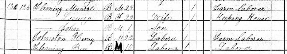 Here are Munroe Fleming, aged 22, his wife Lieunza (?), also 22, and their son John, aged one. Living with them are Henry Johnston, aged 22 and Ben Fleming, aged 15, perhaps Munroe’s brother or cousin. Their color is listed as black.