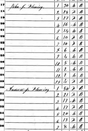 Something else caught my eye in the 1880 Census. Immediately below the listing for John G. Fleming’s household, in the very next residence visited by the enumerator that day, is another Fleming family, one I had not encountered before.