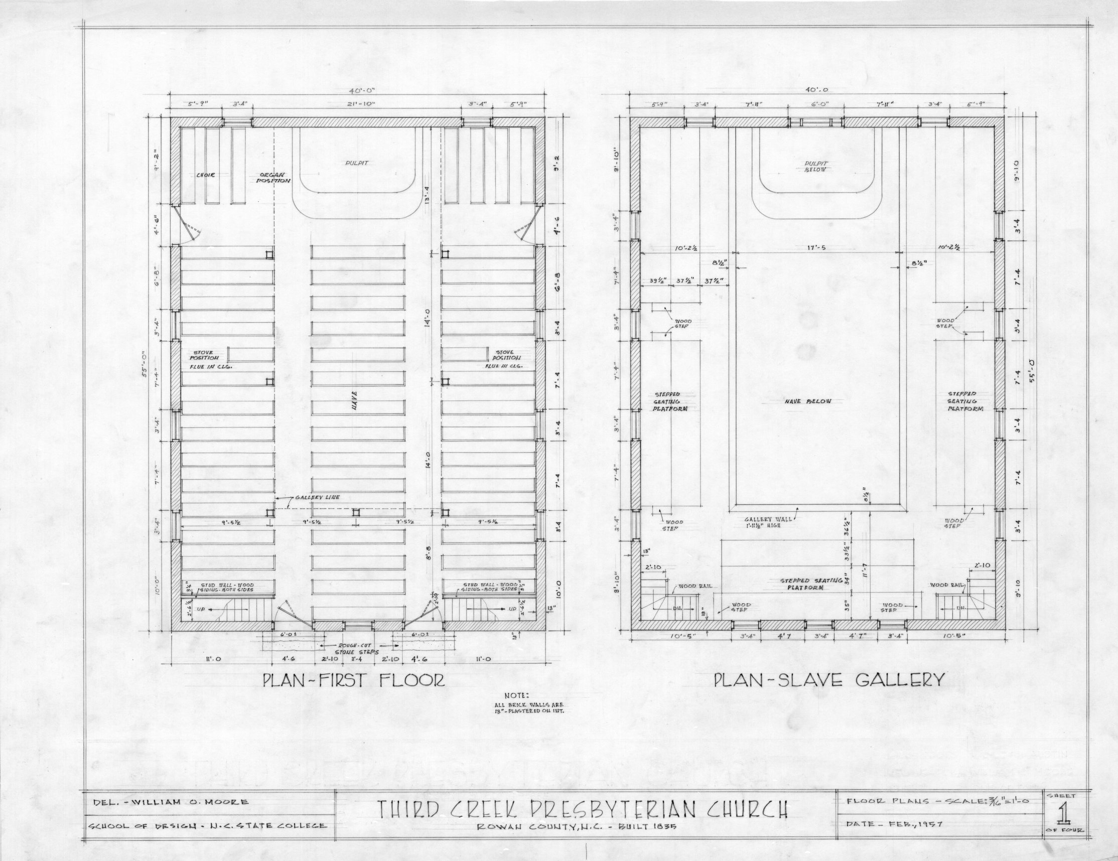 Take Third Creek Presbyterian Church itself. No resource I consulted about it – not Fleming’s history, or Davyd Foard Hood’s architectural survey, or the National Register of Historic Places nomination form – prepared me for seeing the architectural renderings below, which represent vividly the status of African Americans in this congregation before the Civil War. What everyone else had referred to simply as the “balcony” of the church is here called what it actually was: the slave gallery, a phrase which both reminds us of the presence of African American worshippers in this religious community and literally puts those worshippers in their place. (After Nat Turner’s slave rebellion in Virginia in 1831, North Carolina law explicitly forbade any black person, slave or free, from preaching in public, or leading “any prayer meeting, or association for worship where slaves of different families are collected together,” thus effectively banning black churches, though slaves continued to develop their own “invisible” religious institutions.)