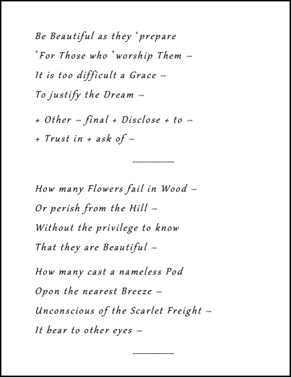 2013-12-14_20-40-41 Published December 15, 2013 at 418 × 541 in My Blue Peninsula, Part One ← Previous Next → Fascicle 28, p. 12: “I reckon – When I count at all –” (cont’d); “How many Flowers fail in Wood –”