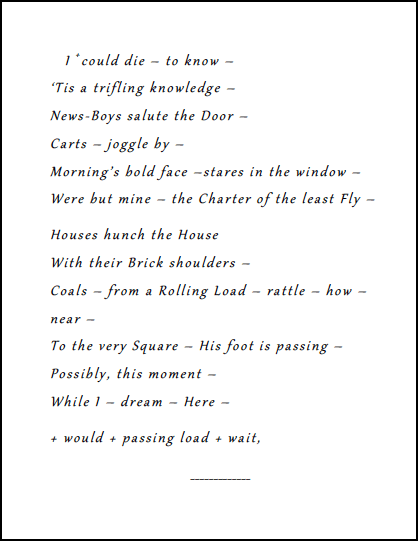 2013-12-14_20-55-32 Published December 15, 2013 at 418 × 541 in My Blue Peninsula, Part One ← Previous Next → Fascicle 28, p. 15: “I could die – to know –”