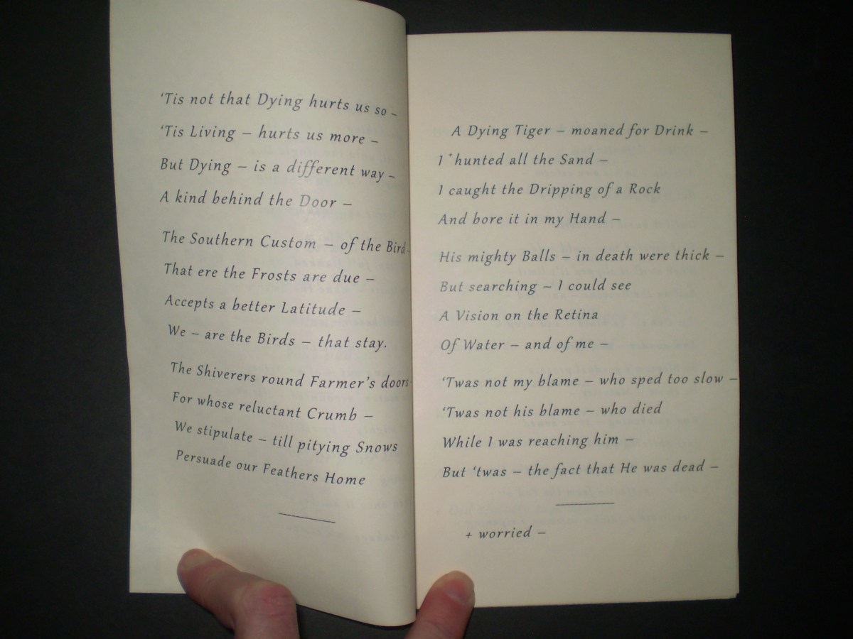 OLYMPUS DIGITAL CAMERA Published December 17, 2013 at 3072 × 2304 in My Blue Peninsula, Part One ← Previous Next → Fascicle 28, pp. 4-5: “‘Tis not that Dying hurts us so –”; “A Dying Tiger – moaned for Drink –”