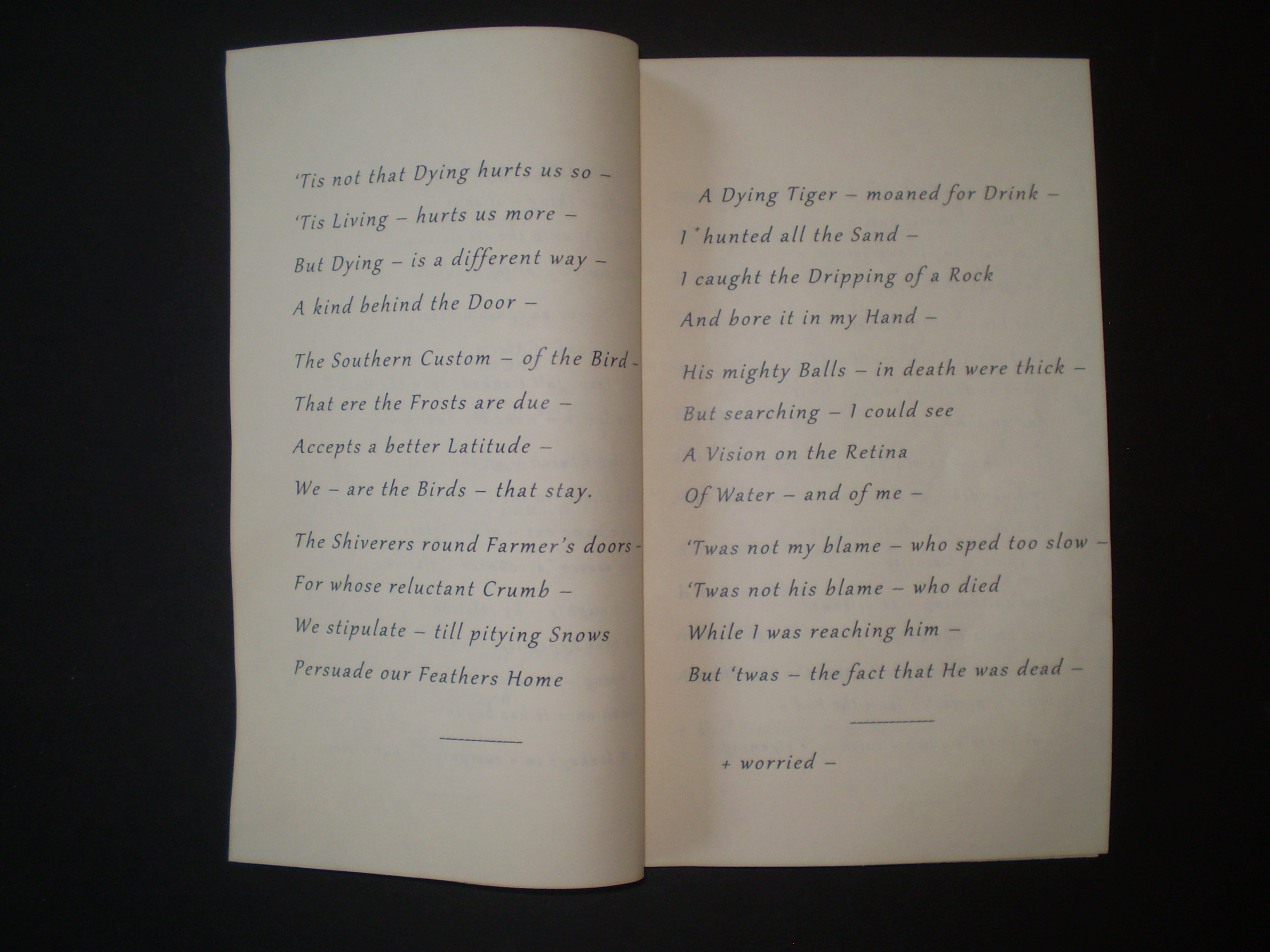 OLYMPUS DIGITAL CAMERA Published December 19, 2013 at 3072 × 2304 in My Blue Peninsula, Part One ← Previous Next → Fascicle 28, pp. 4-5: “‘Tis not that Dying hurts us so –”; “A Dying Tiger – moaned for Drink –”