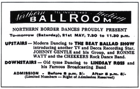 The next night, Saturday, May 21, the lads backed Johnny in the Northern Meeting Ballroom in Inverness. Again, they are the “group” behind the singer. Ironically, when the Beatles later emerged on their own, their lack of a lead singer would make them distinctive – they really were a “group.” All the other Liverpool bands were Somebody and the Somethings: Rory and the Hurricanes, Garry and the Pacemakers, Cass and the Cassanovas. Although John Lennon was always clearly the “leader,” the three principal musicians – John, Paul, and George – genuinely shared singing duties, sometimes literally alternating lead on different songs: John on the ones he liked, next Paul, then George, etc. Often, John and Paul would sing lead in unison; and always there were intricate harmonies and great backing vocals.