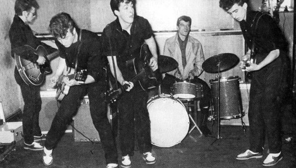Here’s what happened: in early May, 1960, the newly christened “Beatles” (John Lennon, Paul McCartney, George Harrison, and Stuart Sutcliffe, John’s friend from art school, who was just then learning the bass) heard about an opportunity to back a singer in Scotland for a week – for pay. So, on Tuesday, May 10, they auditioned in a club in downtown Liverpool, borrowing a drummer, Tommy Moore, from another group.