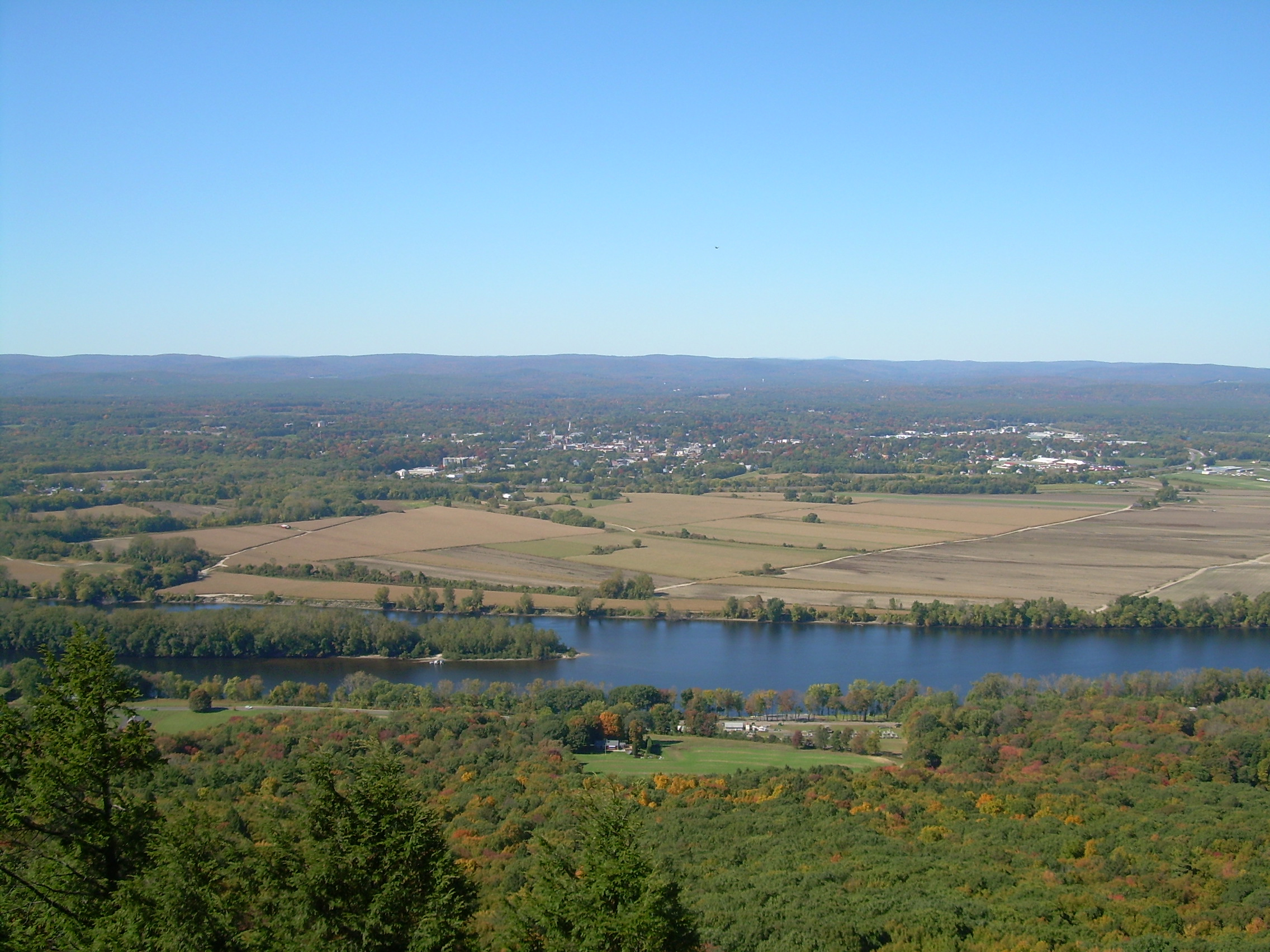 Looking again at Cole’s painting, something began to dawn on me. The meadows of Northampton were still here! And I had seen them! In the fall of 2006, soon after I moved here, I climbed Mt. Holyoke with my daughter Izzy and took a photograph from the place where Thomas Cole had made his painting of the Oxbow nearly two hundred years ago – though I was facing more northerly than he was. There, right across the Connecticut River, and between it and tiny Northampton, just visible in the center background, were the meadows of Northampton – as open, extensive, and fertile as they’d ever been (though not especially green in this October shot).