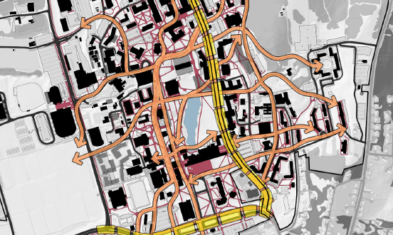 The fact is that the current UMass Amherst campus is essentially an academic core ringed by two- and four-lane thoroughfares designed for the speed and convenience of motor vehicles and literally separating students’ residential and dining facilities from their classrooms, libraries, and meeting spaces. The two maps below show, first, the way residential areas (in yellow) are located on the perimeter of campus, surrounding the academic areas (in blue); and, second, how pedestrian routes connecting those two areas cross fast-moving vehicular arteries ringing the campus core (in fact, the map of pedestrian-vehicle conflicts doesn’t even include Commonwealth Avenue, the scene of the most recent accidents!).