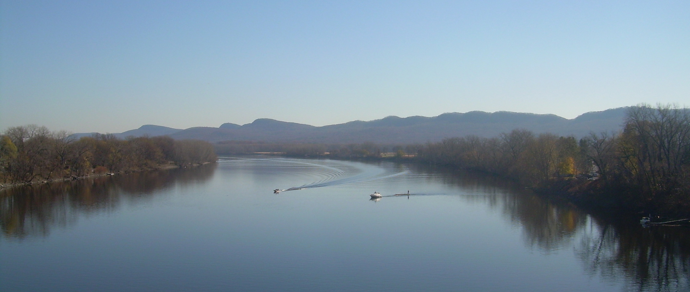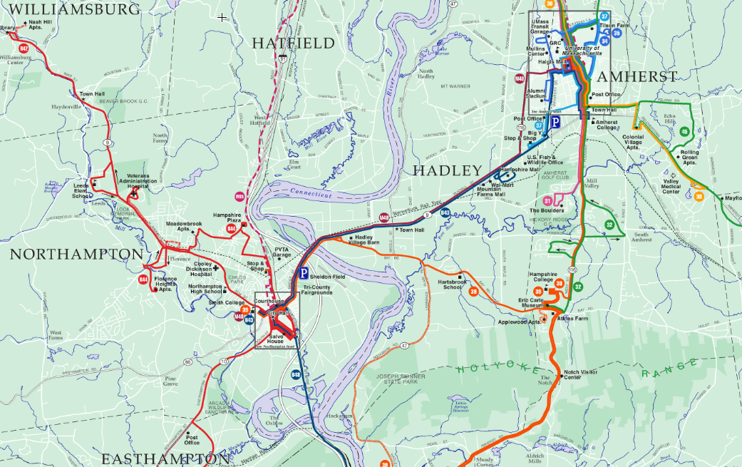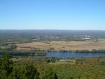 For the towns along Massachusetts Route 9 north of these hills – namely, Northampton, Hadley, and Amherst – the range is a prominent feature of the local landscape. In fact, one can visually organize this area, sometimes called the Upper Pioneer Valley, along three axes: the Connecticut River, which flows roughly north-south; Massachusetts Route 9, which crosses the river on the Calvin Coolidge Bridge in Northampton and travels roughly east-west; and the Holyoke Range, several miles south of that, also oriented east-west.