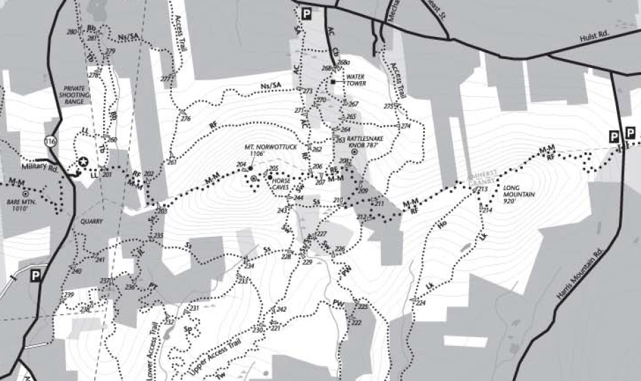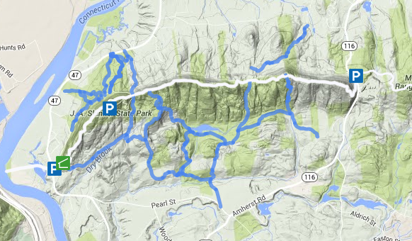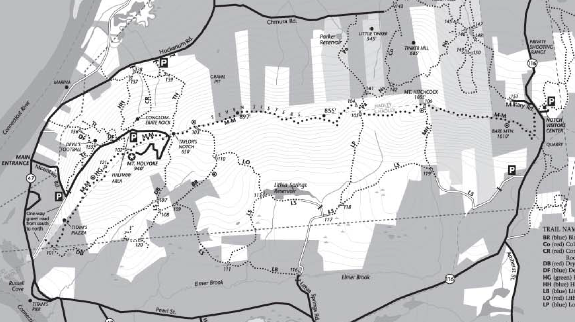 The part of the NET that traverses the ridgeline of the western Holyoke Range is officially known as Section 7 of the Metacomet-Monadnock (M-M) Trail. It extends from Massachusetts Route 47 in Hockanum, on the east bank of the Connecticut River, to MA 116 at Granby Notch, approximately 6 miles in length. (The part I hiked, from Granby Notch to the Summit House and back, is between the middle and eastern parking lots, marked with blue P’s below; an alternative to the circuit hike described here is a one-way hike followed by a ride in one car back to another. Of course, that takes two cars and lots of planning. And you only have half the fun.)