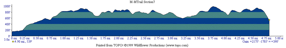 By way of contrast, here’s the elevation profile of Section 07 of the M-M Trail (one way), moving west to east (Hockanum to Granby Notch), from the AMC Berkshire Chapter’s online hiking guide: