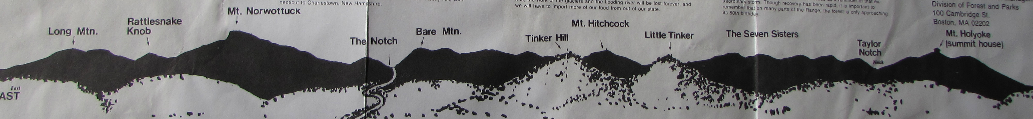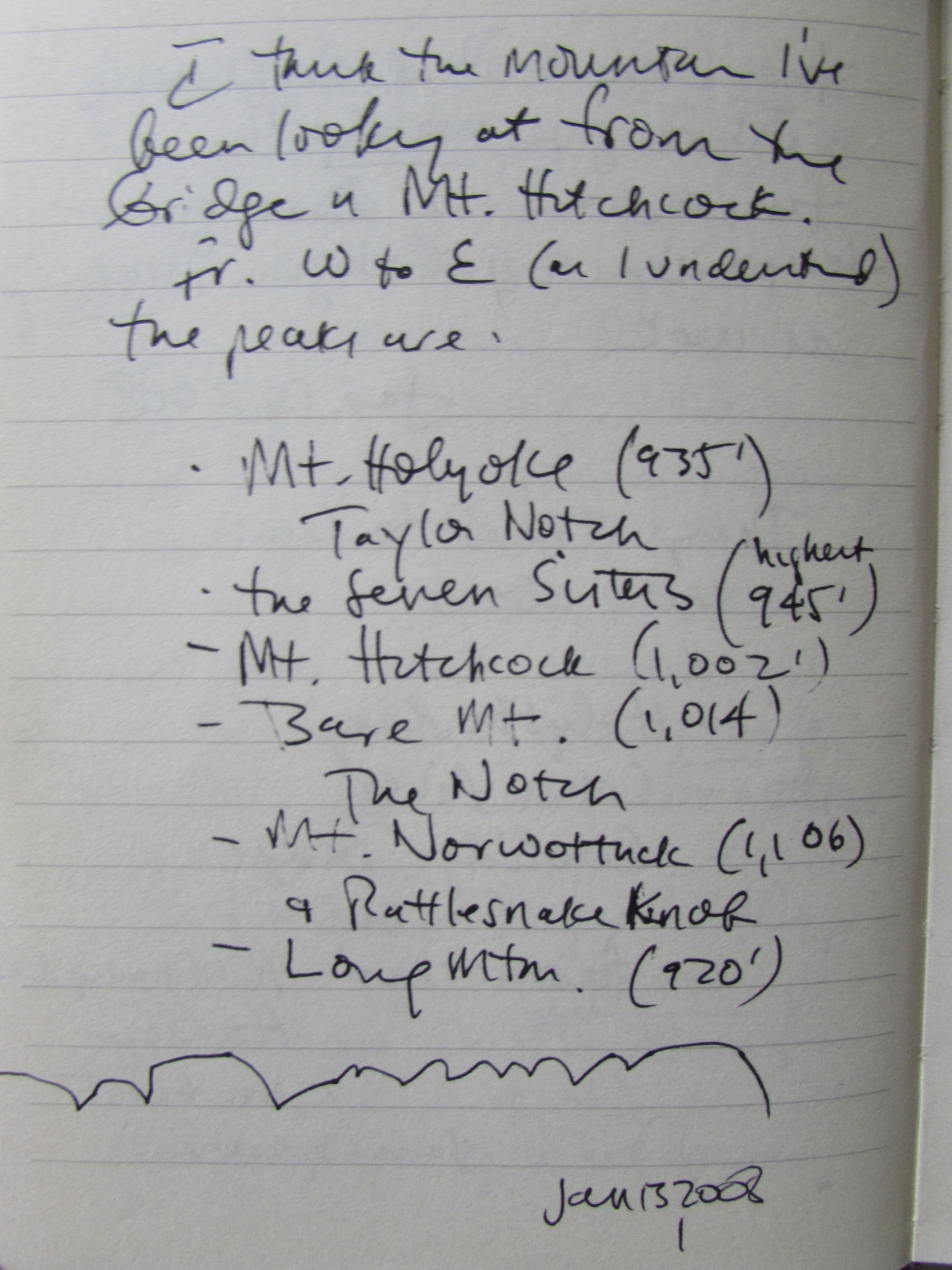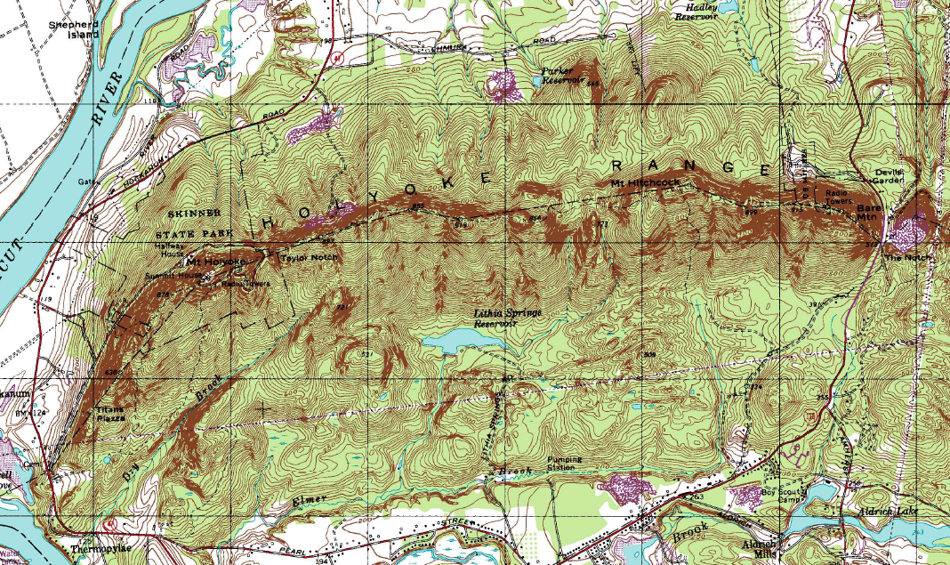 On the bridge, I began to trace my finger along that line – starting from Mt. Norwottuck in the east and following the undulating ridge west, or, starting from Mt. Holyoke in the west and moving my finger up and down to the east. Framing the eastern end, there was the relatively deep Granby Notch; on the western end, the shallower Taylor Notch. Between them were several features that, it turns out, did have names. From east to west – or, left to right when looking from the Coolidge Bridge – they were, first, Bare Mountain and, then, Mt. Hitchcock, with a smaller, unnamed peak between and the low, dome-like Tinker Hill in front, outside of the east-west line of the rest of the range. After Mt. Hitchcock, moving west, came a long, rather gentle-looking slope down to what some maps called “The Low Place,” and then a short rise up to a series of smaller peaks, undulating up-down, up-down, all the way to Taylor Notch. These were the Seven Sisters.