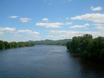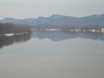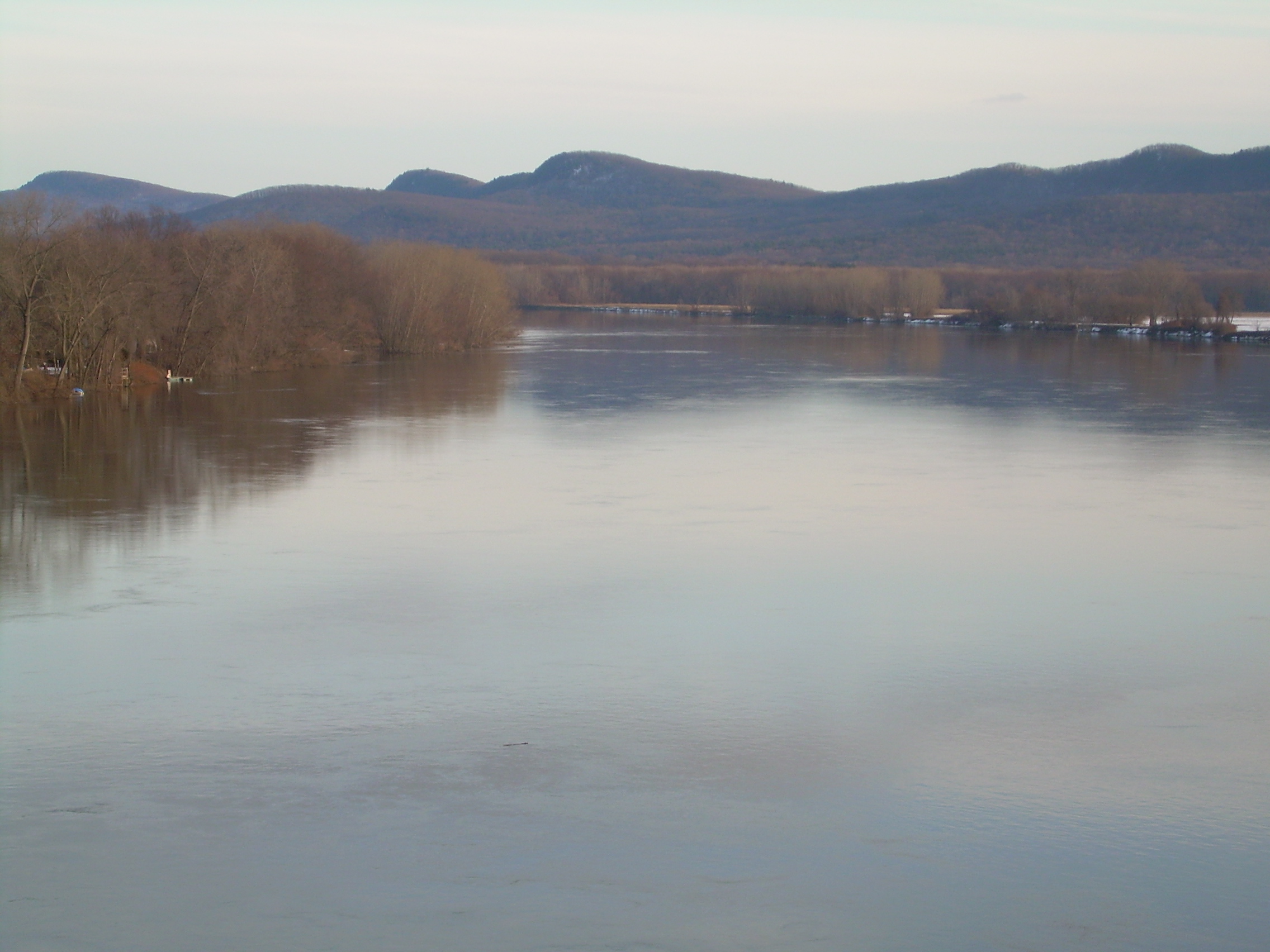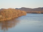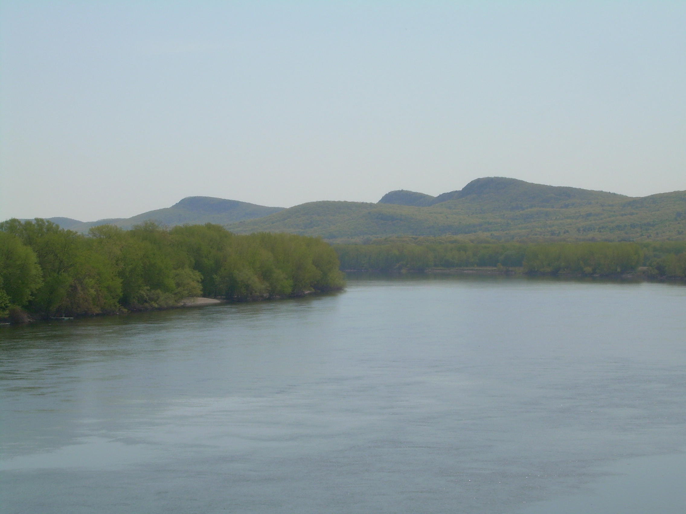 In the far left of my viewfinder, of course, was the distinctive bulk of Mt. Norwottuck, with its sheer northern face, the tallest peak in the Holyoke Range, and historically and geologically interesting in its own right. It was on the other side of Granby Notch from the rest of the range, in a whole other state park. I had been there several times with one or both of my daughters. We would get box lunches at Atkins Farms, park at the Notch Visitors’ Center on Rte. 116, and hike the Robert Frost Trail, on the northern slope of Mt. Norwottuck, in woods cool and dim. We’d explore the Horse Caves, have a picnic on the summit, and later walk back to the Visitors’ Center. It’s a lovely place. But it’s not what I was drawn to from the center of the Coolidge Bridge looking south.