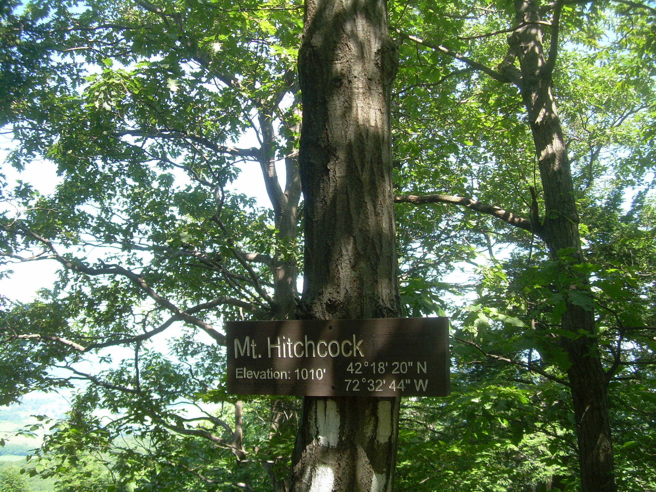 The M-M trail now climbs steeply east to a rocky ledge west of hill 897′, the eastern rim of Taylor Notch. At 3.9 mi. pass over the top of the hill 858′, with limited views north, and at 4.2 mi the top of hill 919′. At 5.2 mi. after a steep climb from the “Low Place” trail junctions, the crest of Mt. Hitchcock is met.