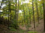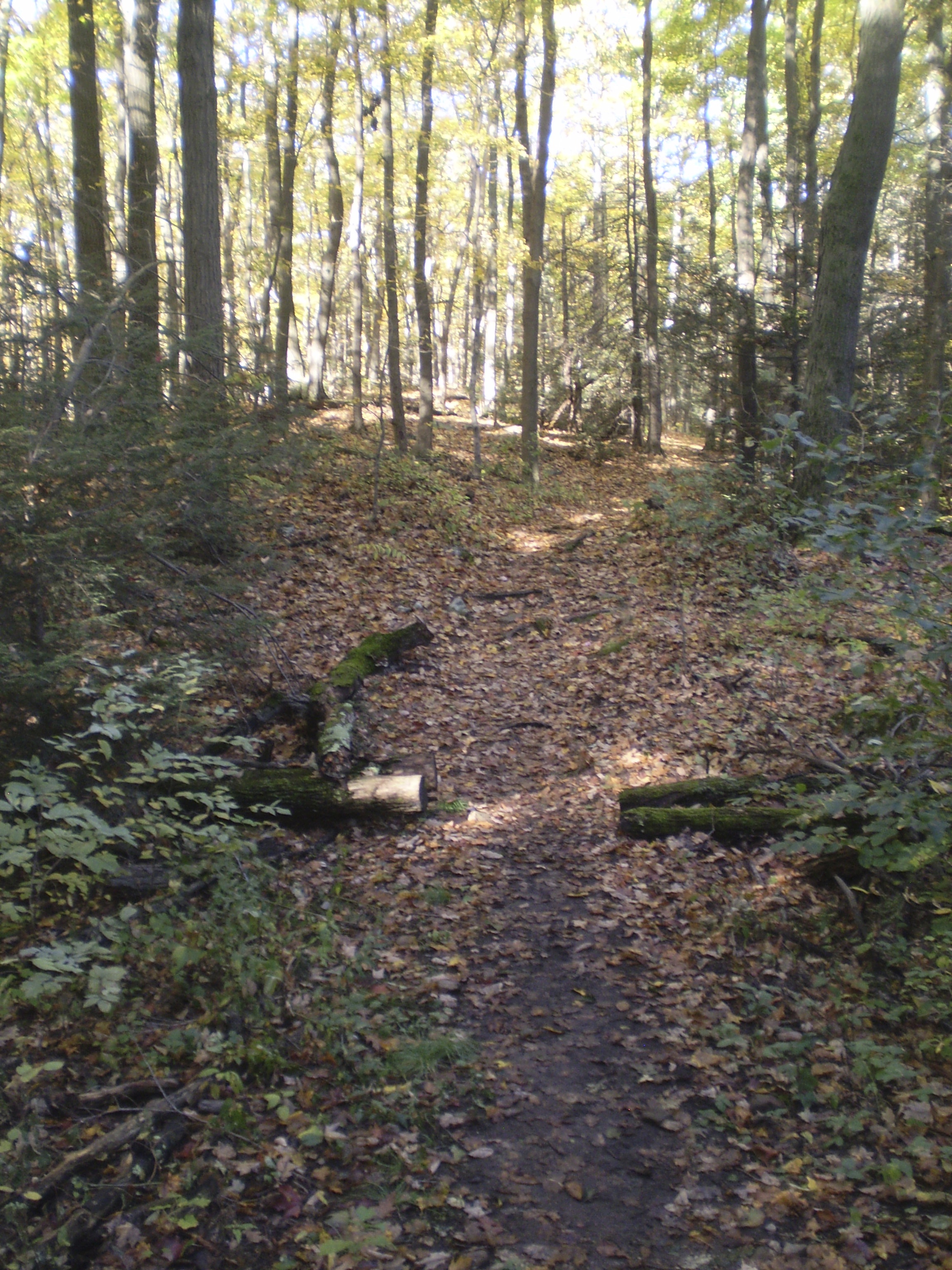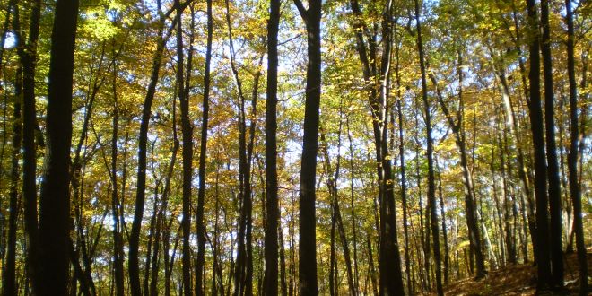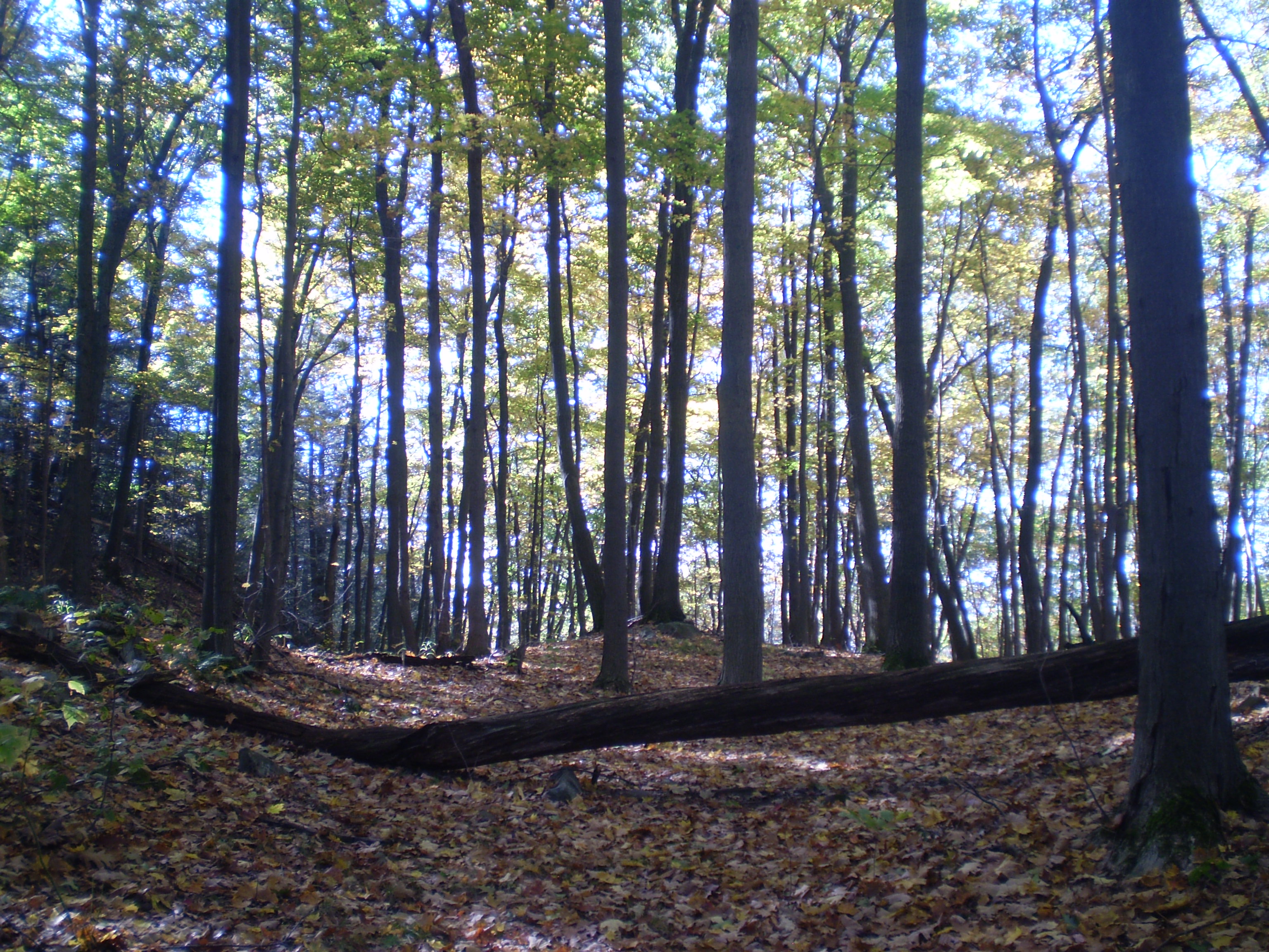 I was alone, deep in a forest, in one of the most densely populated areas of North America. To my sides was a steeply rolling green and brown terrain, crowded with dark vertical lines; above, through golden, swaying leaves, I caught glittering glimpses of a bright blue sky.