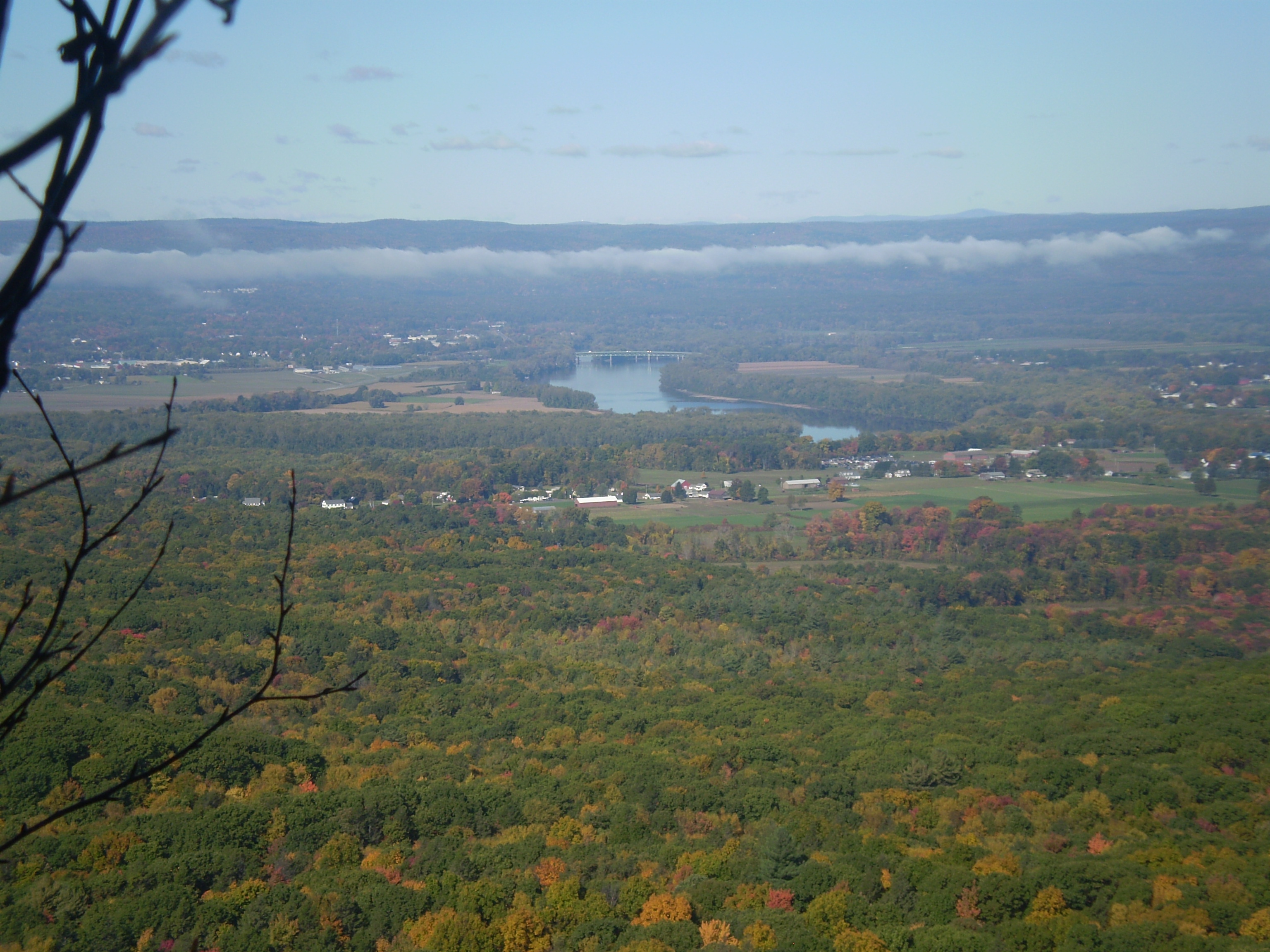 When I arrived at the somewhat cramped lookout on Mt. Hitchcock, with its view north of the Upper Pioneer Valley, there was already a family there, sitting on the rocks. I took a photograph of the Coolidge Bridge, visible in the far distance, and kept walking.