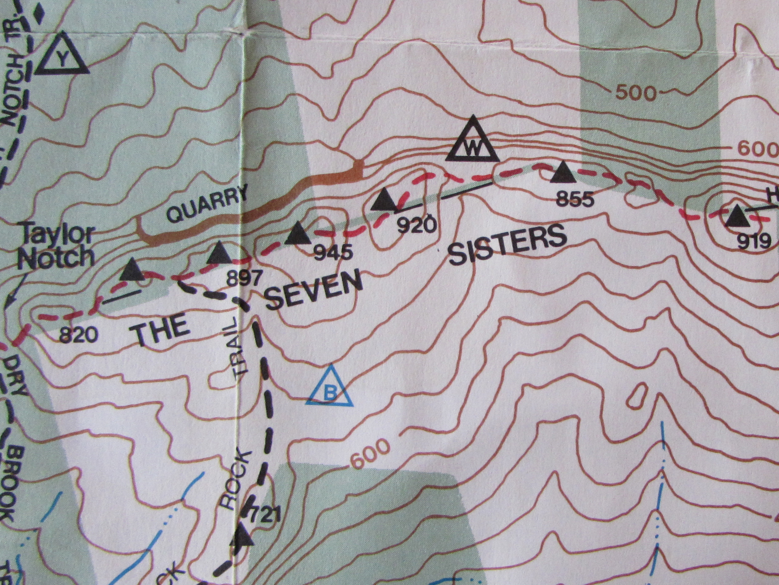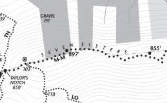 Oddly, the “Seven Sisters” are never mentioned in either Banfield’s original M-M Trail Guide or its latest, tenth, edition, though the name does show up in recent M-M Trail maps. The DCR’s map of Skinner Park also includes the name, though elevations for only two peaks are given there.