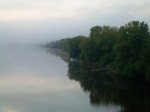 On the appointed day, I left early from Northampton. Crossing the Coolidge Bridge, quiet on a Sunday morning, I couldn’t help but glance over to the right to take in the view. The entire scene was covered in fog – wispy enough that I could still make out the riverbanks and the faint line of the mountains in the distance. I drove east toward the Granby Notch – but before I even got to the Hadley Common, I turned around. Tapping me on the shoulder was my old nemesis: the project. How could I take this daylong hike – only the second time I would ever traverse the western ridge of the Holyoke Range – and not record the view from below? So I went back to Northampton, pulled in to the little parking lot on Damon Road, and walked up to the bridge to take my first photograph from the southern rail in nearly five years.