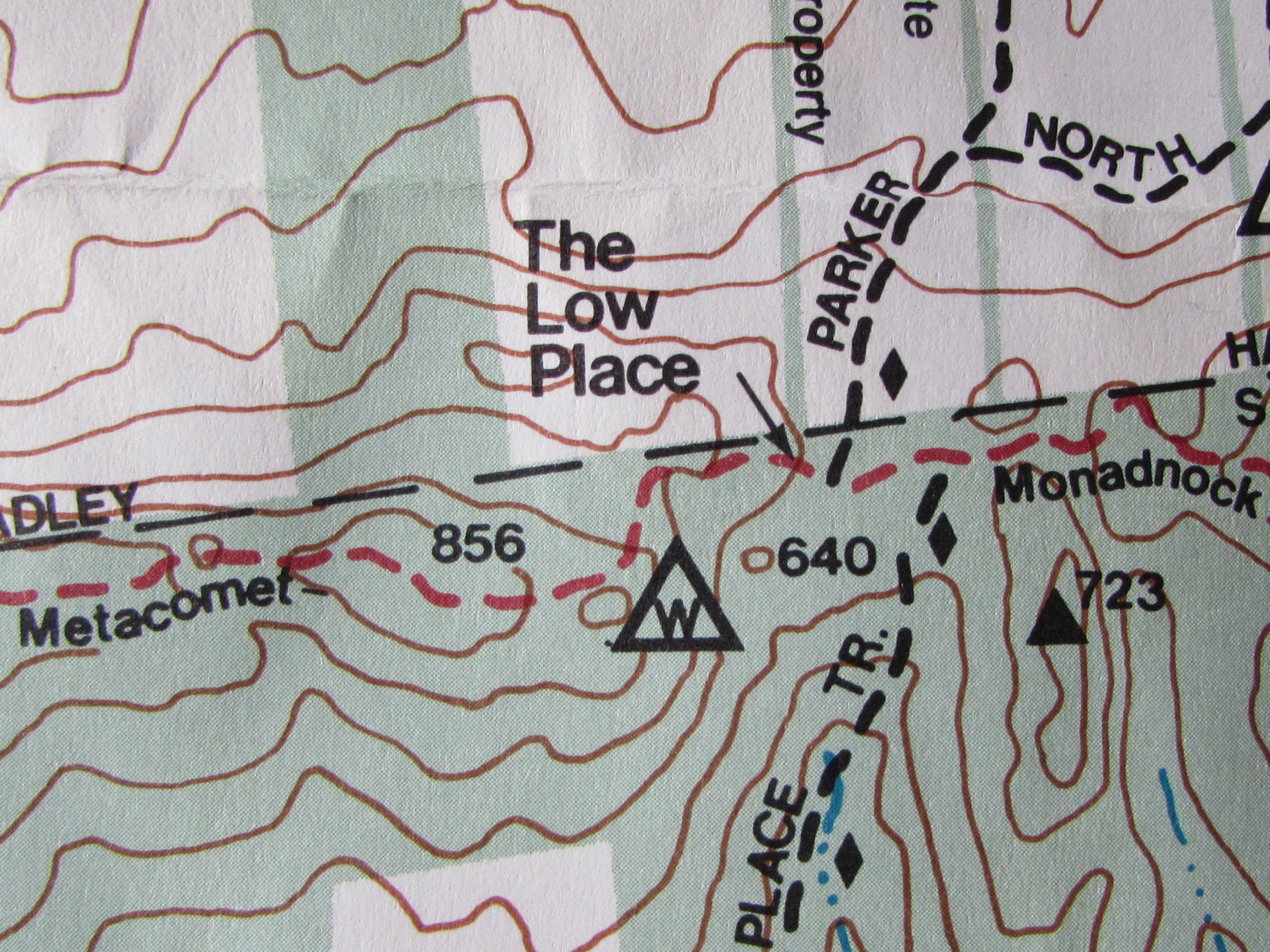 At the bottom of the slope, between Mt. Hitchcock and the Seven Sisters, is the Low Place. Suddenly, after all the intense ups and downs of the first part of the hike – the steep climb up Bare Mountain, the many hills between it and Mt. Hitchcock, and the long descent from that latter peak – and before another set of climbs and descents to come, there’s a lovely moment of flatness, of level ground, of ease and relaxation, at the bottom. The terrain is so gentle here you’re able, for what seems like the first time all day, to stop and look up, to admire the treetops, to take in the forest view all around you. And, because this is also a place where several trails converge – the white-blazed M-M Trail going east-west intersects here with the blue-blazed Low Place and Parker Trails going north-south – one has the feeling of being at a kind of crossroads.