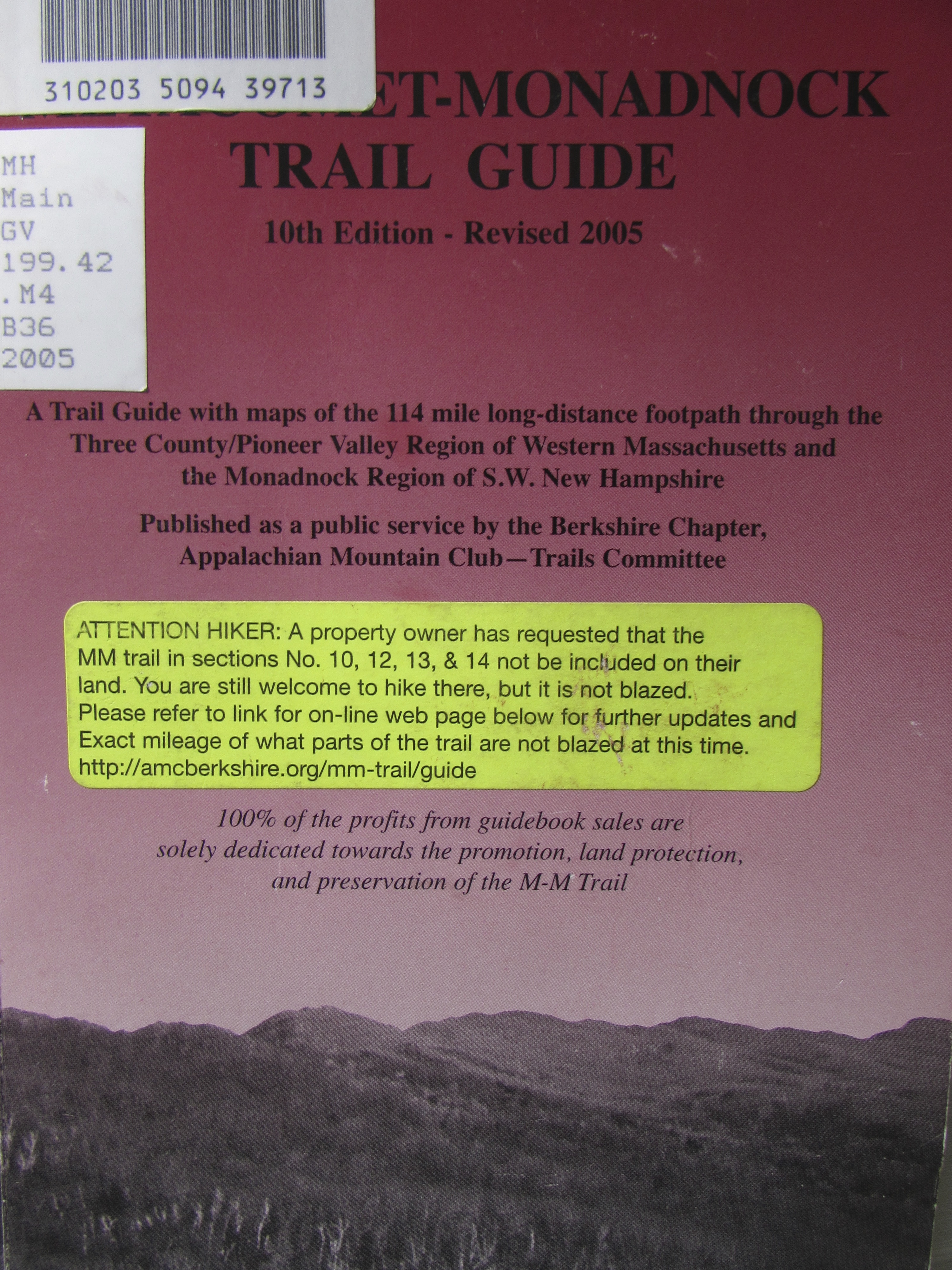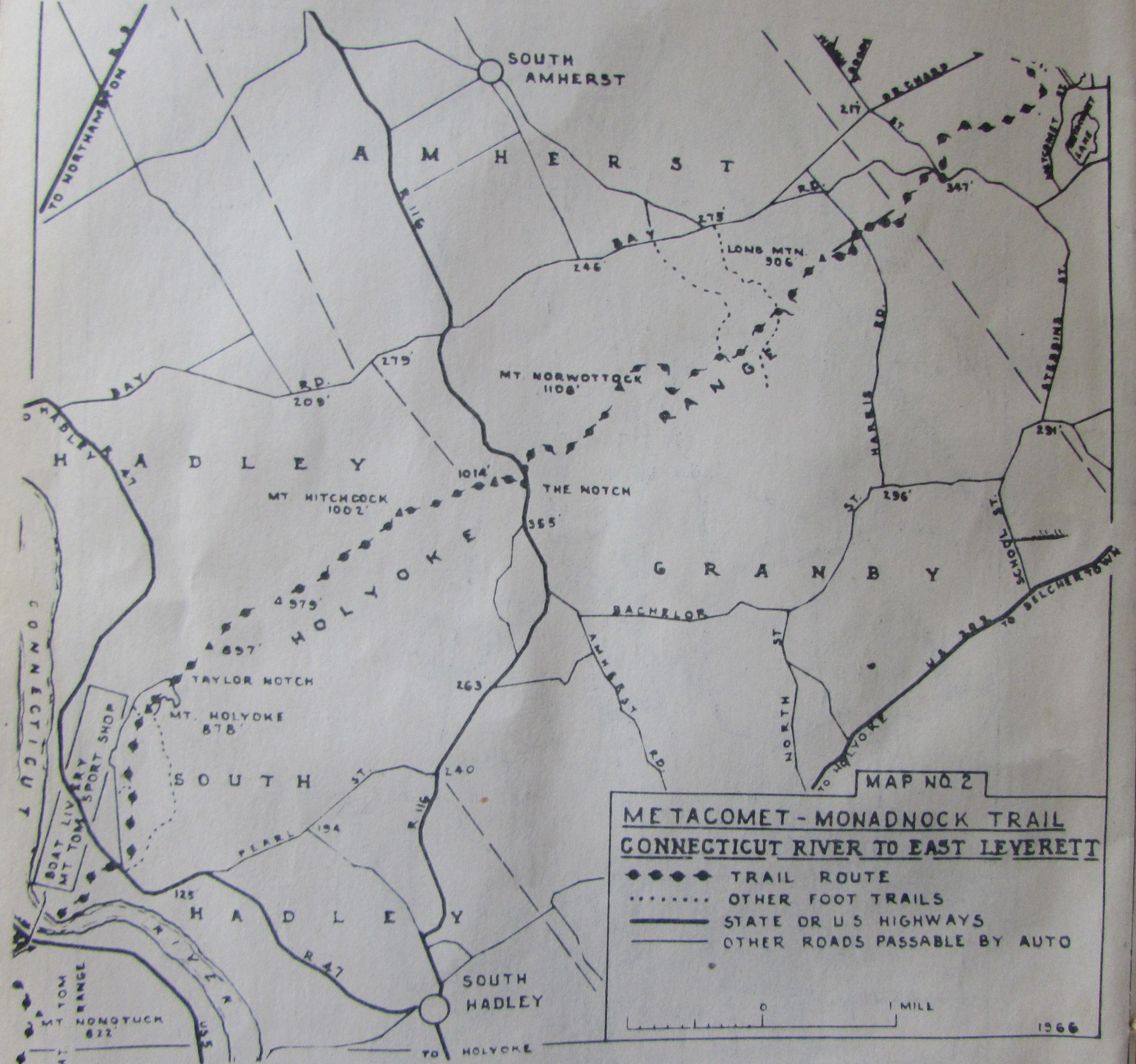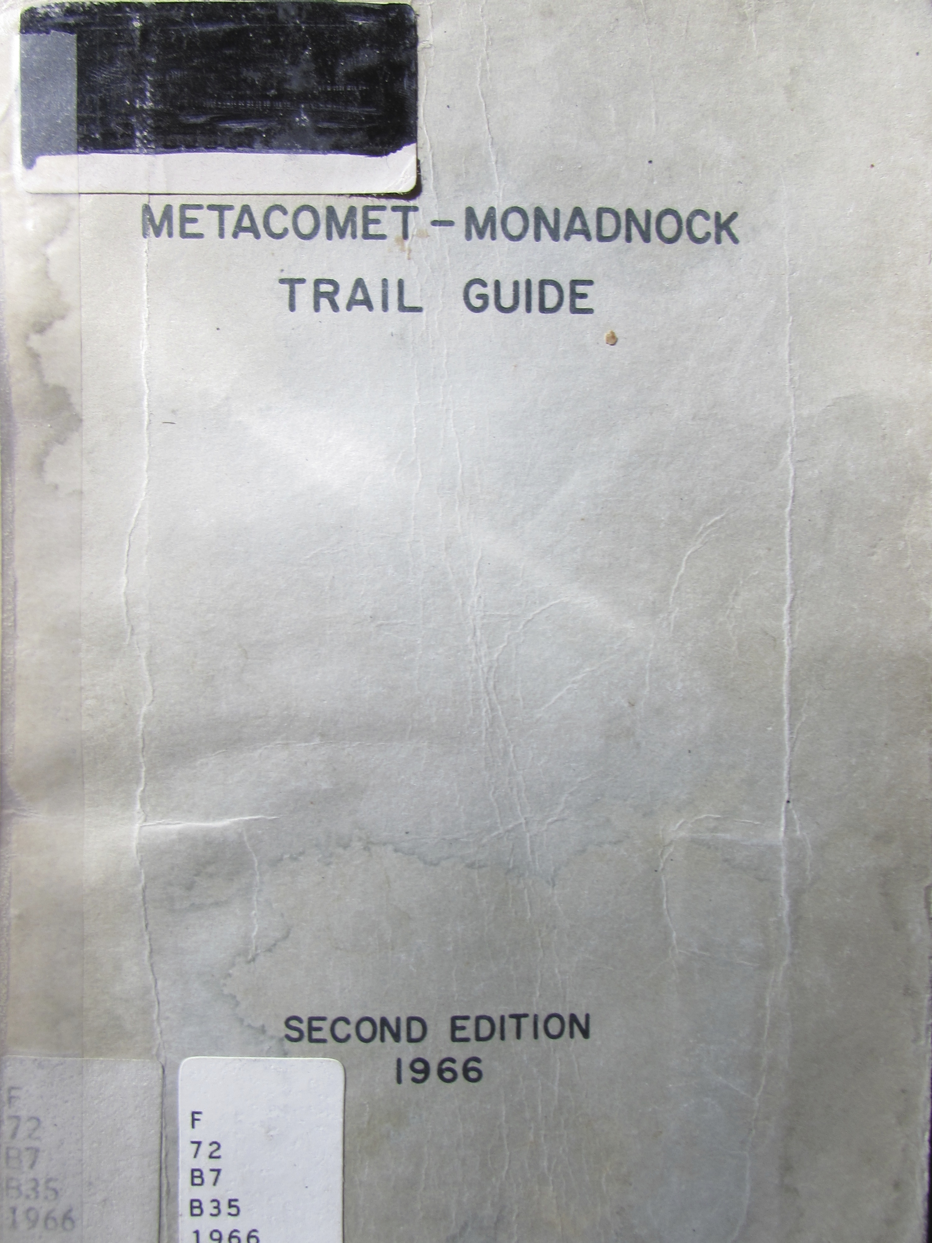 Walter Banfield et al.’s Guide to the Metacomet-Monadnock Trail in Massachusetts and New Hampshire, second ed., was published by the Berkshire Chapter of the Appalachian Mountain Club (AMC) in 1966. (I would like to have found a first edition for this post; alas, I did not.) The tenth edition, now called Metacomet-Monadnock Trail Guide, was published by the same group in 2005 (information on ordering the book can be found here).