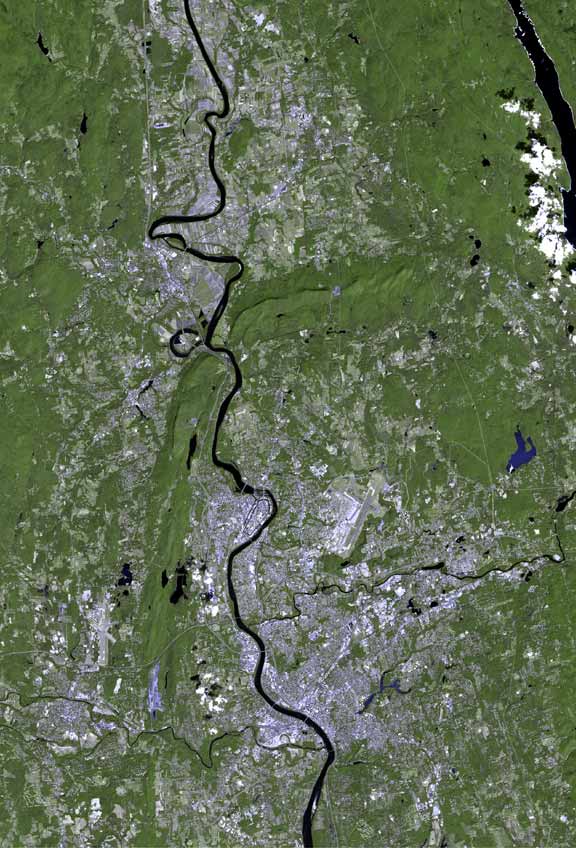 Why is this middle section of the western Holyoke Range, so stunningly on display from the Coolidge Bridge, so neglected in area hiking guides? The main reason, I believe, is that this part of the M-M Trail is almost all forest interior. As both the second and tenth editions of the M-M Trail Guide put it, with apparent disappointment, “From Taylor Notch to Granby Notch, there are only a few lookout points.” And yet, as I realized after my first hike from notch to notch, in 2009, the Holyoke Range is not only a place of peaks and vistas; it’s also, even primarily, a place of woods, evident in this USGS satellite image: