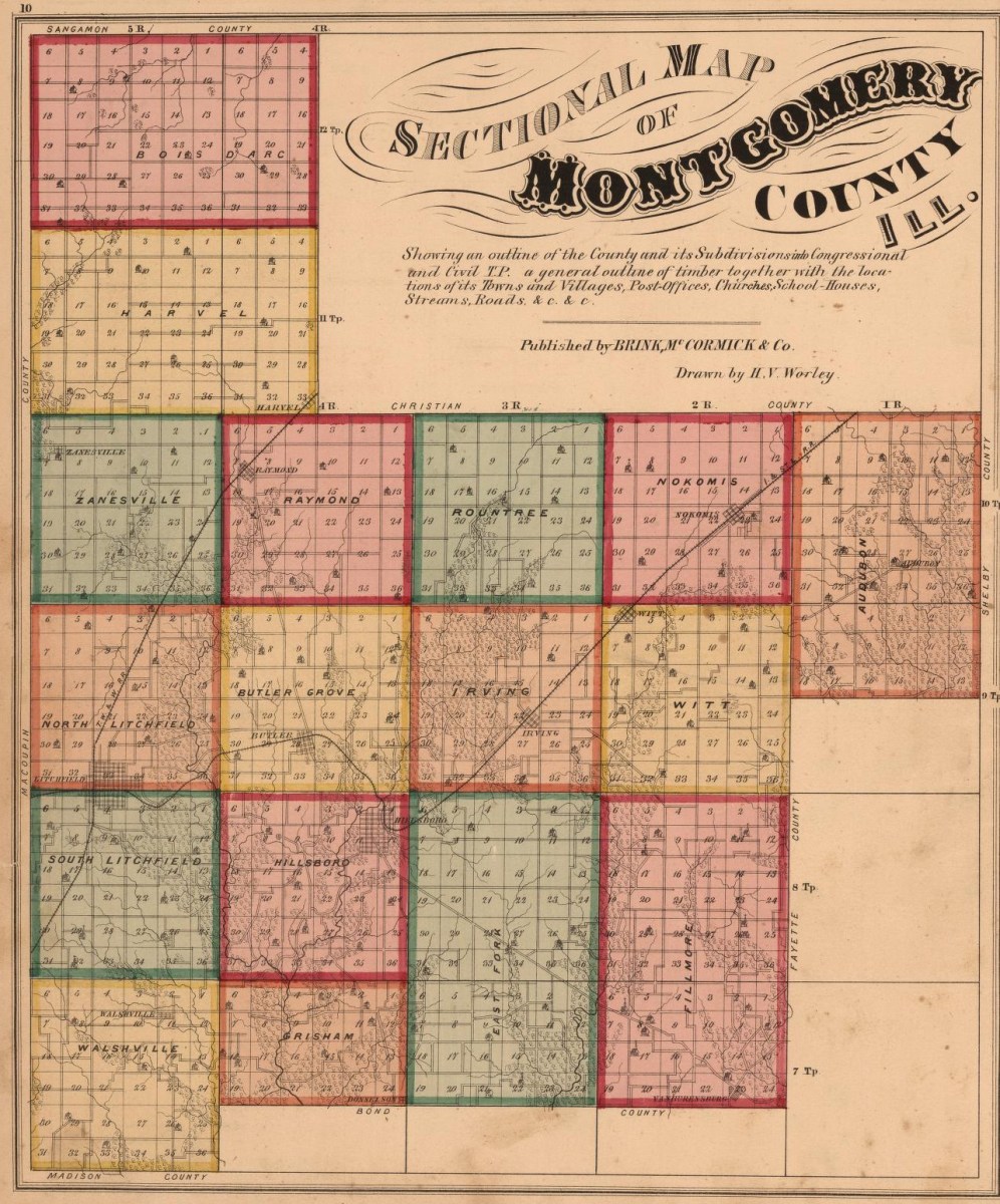MontgomeryCounty1874v2 Published December 16, 2014 at 1283 × 1546 in The Churches of Russell Wallis, Part One ← Previous Next → 1874 Brink, McCormick map of Montgomery County, Illinois
