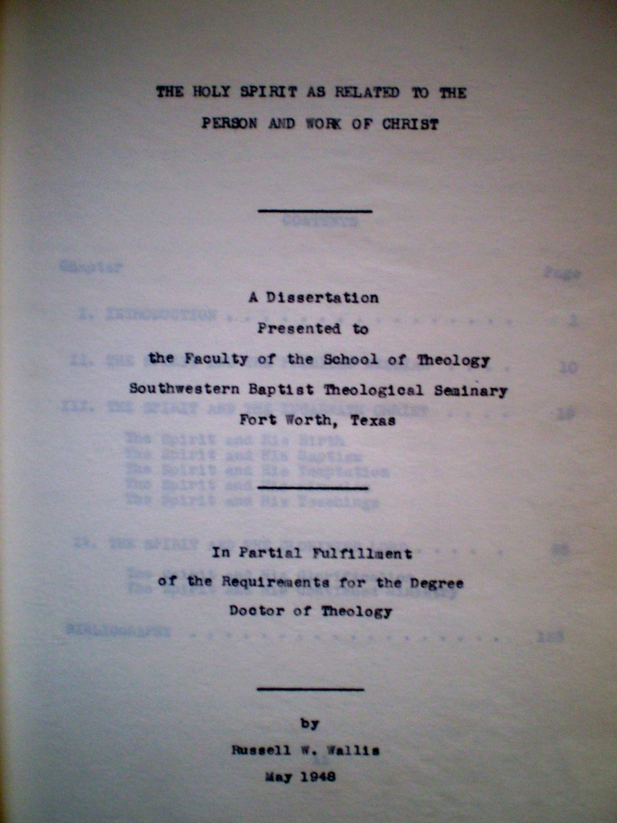 OLYMPUS DIGITAL CAMERA Published December 27, 2014 at 2304 × 3072 in The Churches of Russell Wallis, Part Two ← Previous Next → Cover page of my grandfather’s Th.D. dissertation (May, 1948)